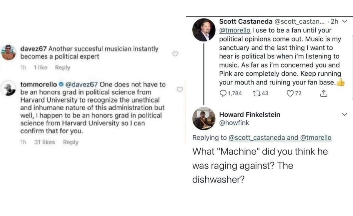 Καλά, δύο ακόμα: μια παλιά απάντηση του Tom Morello, κιθαρίστα των Rage Against the Machine, σε έναν random εξυπνάκια και μια τωρινή απάντηση ενός “φαν” των RATM προς τον Morello.